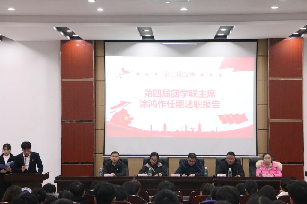 大会在庄严的国歌声中拉开帷幕。会上,全体师生一起观看了上一届团学联活动视频合集。第四届团学联学生主席涂鸿作任期述职报告,第五届团总支学生书记赵杨作就职演说。学生科科长贺利强宣读了第五届团学联干部名单。全体管理人员为第四届团学联干部颁发了聘书。